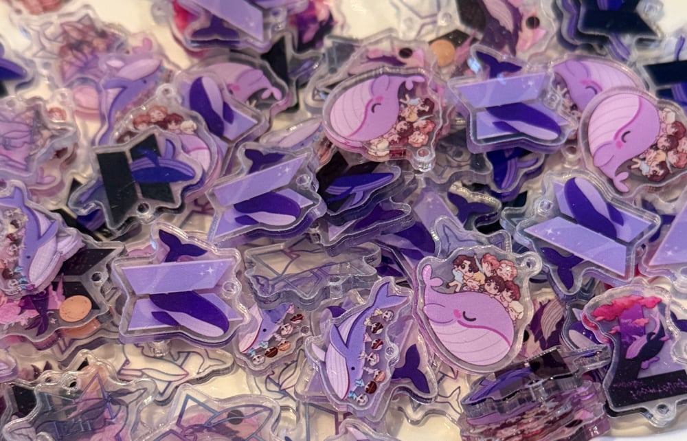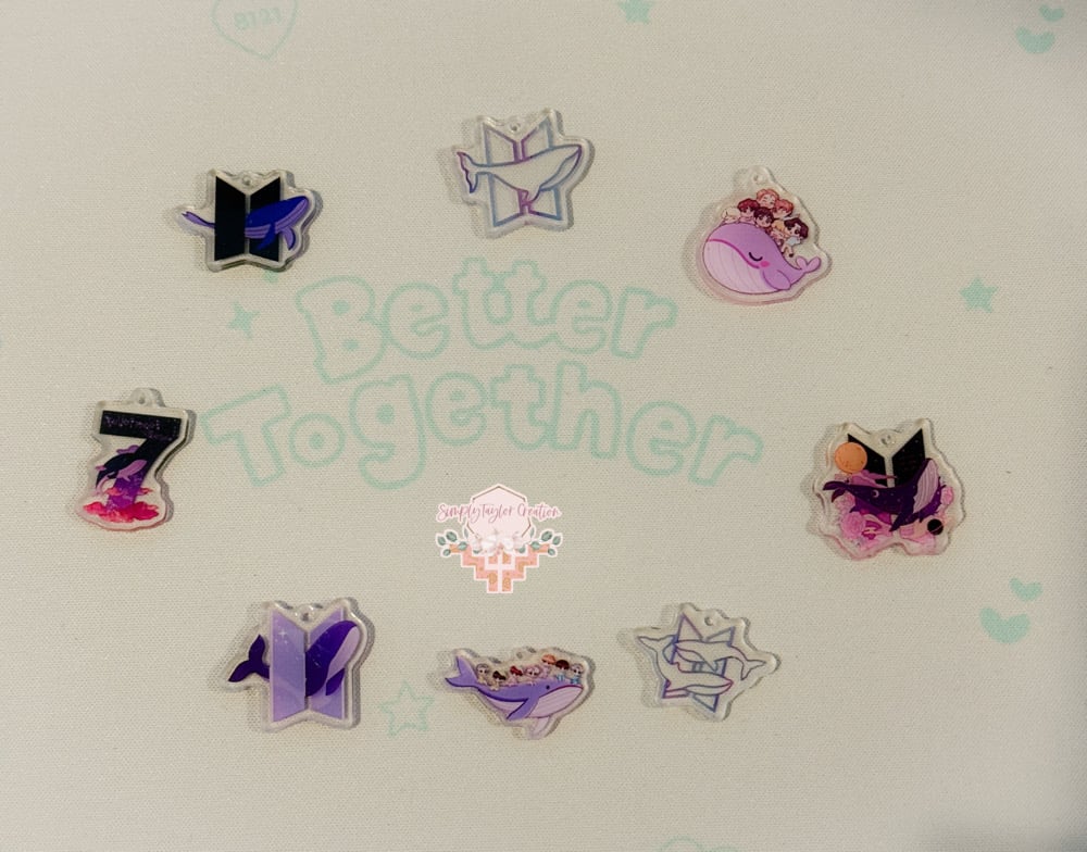 This listing is for our 20 pieces mixed BTs whale 2cm Acrylic charms. Each Acrylic come with clear protection film.